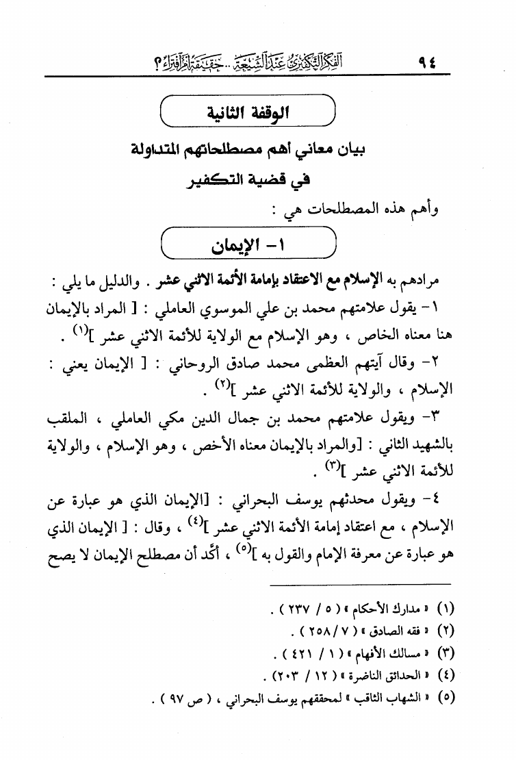 نام کتاب : الفكر التكفيري عند الشيعة حقيقة أم افتراء دراسة موثقة من مرويات الشيعة وتقريرات علمائهم أساساً ومحوراً لها في لفاطة اللثام عن هذه القضية الخطيرة نویسنده : عبد الملك بن عبد الرحمن الشافعي جلد : 1 صفحه : 94