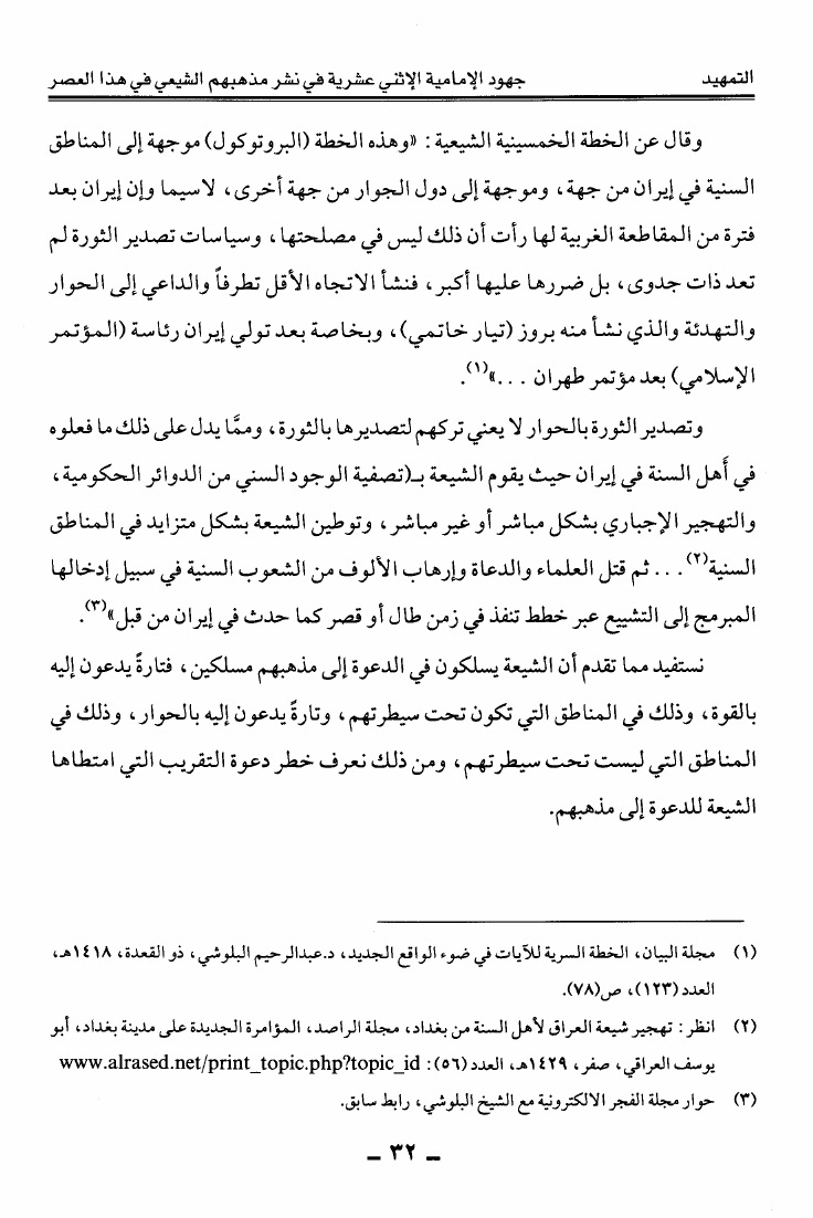 نام کتاب : دعوى التحول إلى مذهب الإمامية الاثني عشرية على شبكة المعلومات العالمية الانترنت عرض ونقد نویسنده : عبد الله بن منصور أبو حيمد جلد : 1 صفحه : 32