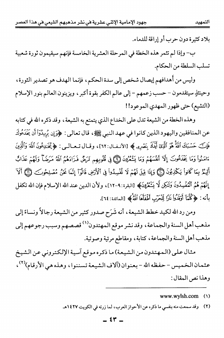 نام کتاب : دعوى التحول إلى مذهب الإمامية الاثني عشرية على شبكة المعلومات العالمية الانترنت عرض ونقد نویسنده : عبد الله بن منصور أبو حيمد جلد : 1 صفحه : 43