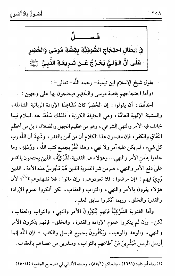 نام کتاب : أصول بلا أصول: بحث وافي في رد عدوان الصوفية ومدعي المهدية على مصادر التلقي والمرجعية الشرعية نویسنده : محمد بن أحمد إسماعيل المقدم جلد : 1 صفحه : 258