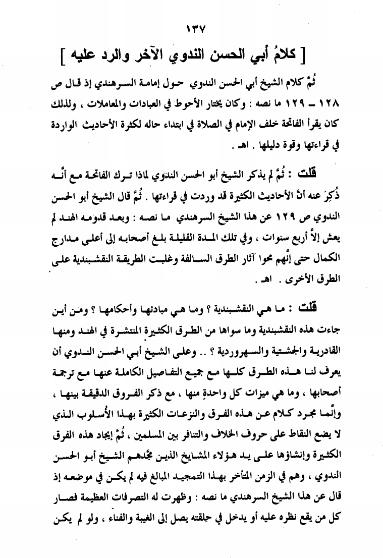 نام کتاب : الرد الأوفر على فقه الشيخ الأكبر ويليه إتمام البحث والرد على الإنسان الكامل والقطب الغوث الفرد نویسنده : عبد القادر بن حبيب الله السندي جلد : 1 صفحه : 137