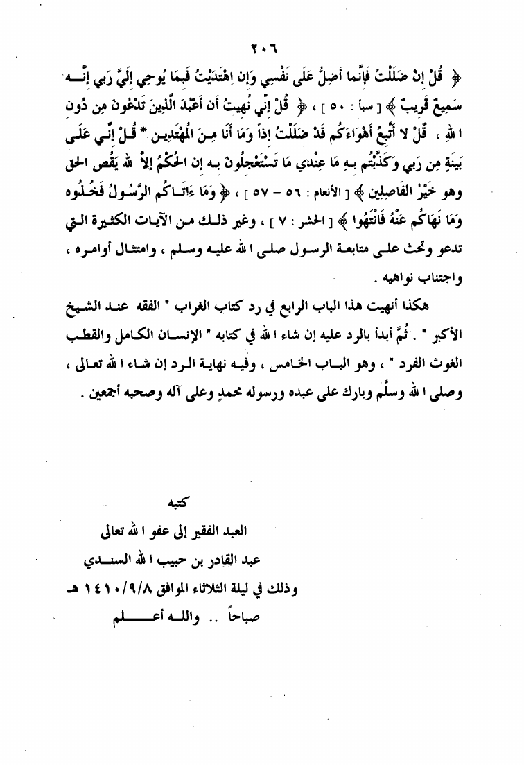 نام کتاب : الرد الأوفر على فقه الشيخ الأكبر ويليه إتمام البحث والرد على الإنسان الكامل والقطب الغوث الفرد نویسنده : عبد القادر بن حبيب الله السندي جلد : 1 صفحه : 206