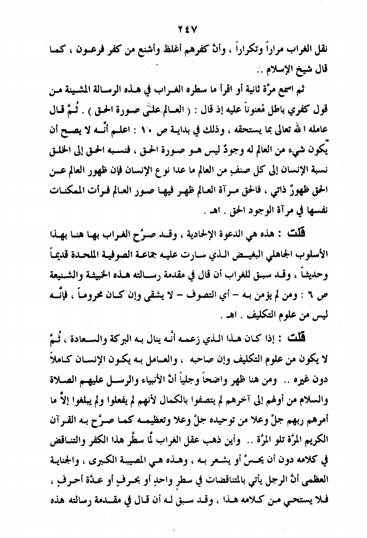 نام کتاب : الرد الأوفر على فقه الشيخ الأكبر ويليه إتمام البحث والرد على الإنسان الكامل والقطب الغوث الفرد نویسنده : عبد القادر بن حبيب الله السندي جلد : 1 صفحه : 247