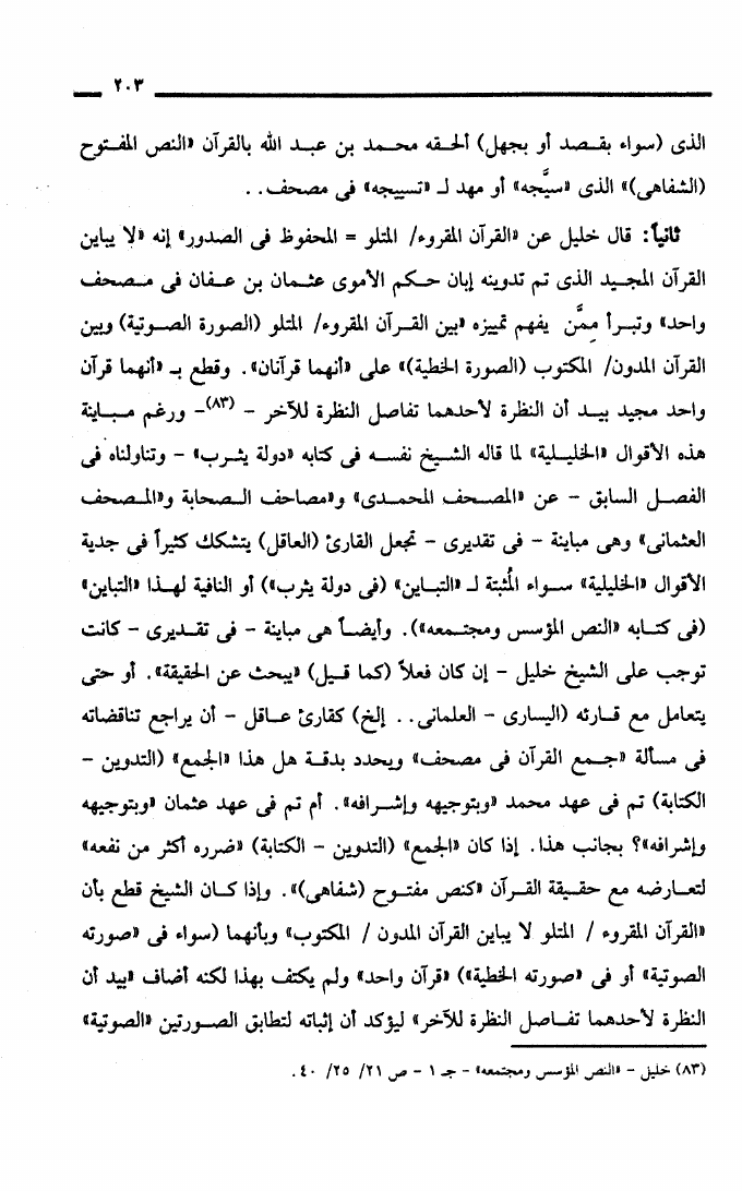 نام کتاب : التنوير بالتزوير مساهمة في نقد علمية الخطاب العلماني الرد على سيد القمني وخليل عبد الكريم ورفعت السعيد نویسنده : منصور أبو شافعي جلد : 1 صفحه : 203