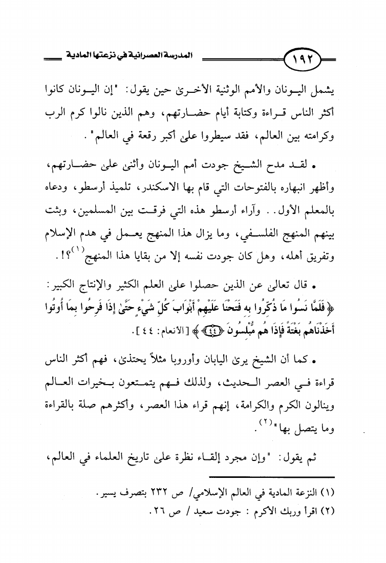 المدرسة العصرانية في نزعتها المادية تعطيل للنصوص وفتنة بالتغريب