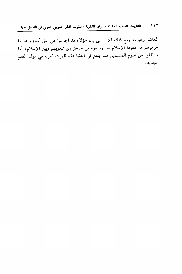 نام کتاب : تأثير النظريات العلمية الحديثة مسرتها الفكرية وأسلوب التفكير التغريبي العربي في التعامل معها دراسة نقدية (ط. أوقاف قطر) نویسنده : حسن بن محمد حسن الأسمري جلد : 1 صفحه : 112