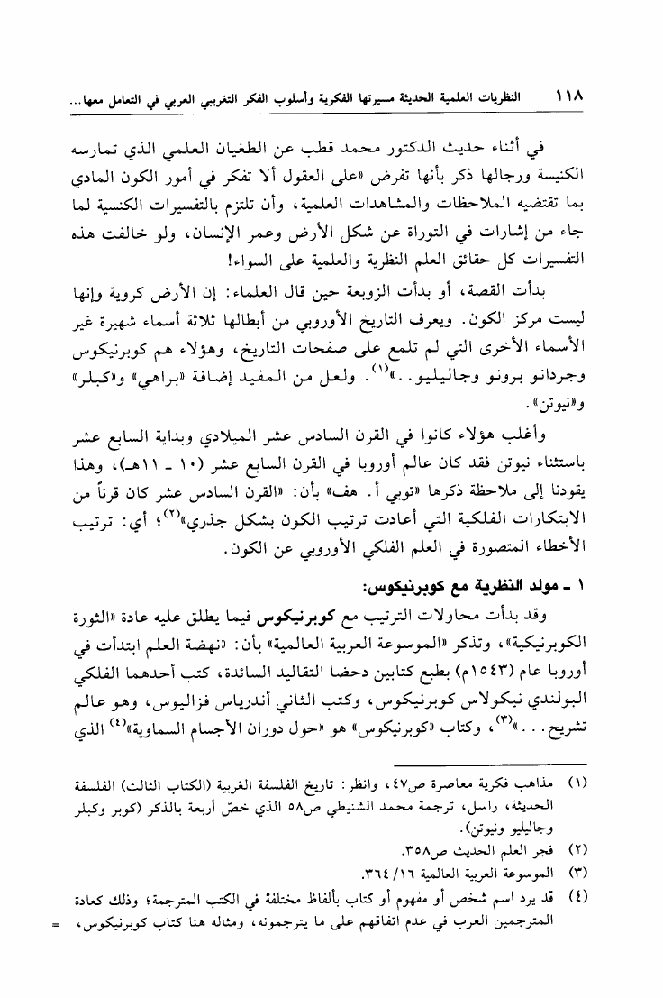 نام کتاب : تأثير النظريات العلمية الحديثة مسرتها الفكرية وأسلوب التفكير التغريبي العربي في التعامل معها دراسة نقدية (ط. أوقاف قطر) نویسنده : حسن بن محمد حسن الأسمري جلد : 1 صفحه : 118