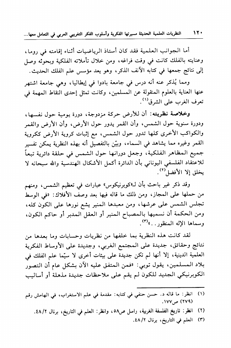 نام کتاب : تأثير النظريات العلمية الحديثة مسرتها الفكرية وأسلوب التفكير التغريبي العربي في التعامل معها دراسة نقدية (ط. أوقاف قطر) نویسنده : حسن بن محمد حسن الأسمري جلد : 1 صفحه : 120