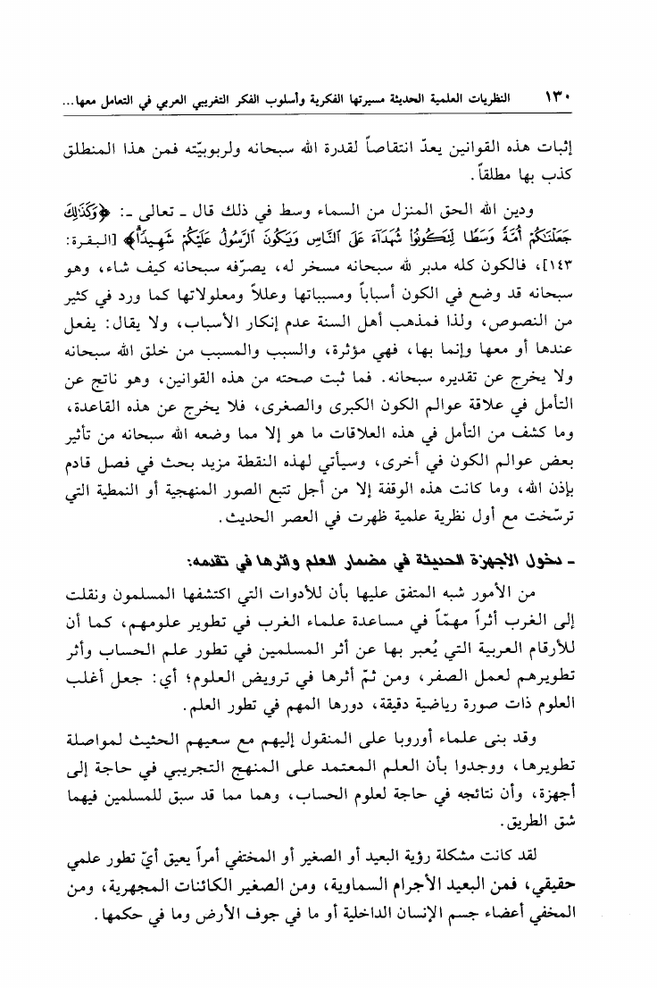 نام کتاب : تأثير النظريات العلمية الحديثة مسرتها الفكرية وأسلوب التفكير التغريبي العربي في التعامل معها دراسة نقدية (ط. أوقاف قطر) نویسنده : حسن بن محمد حسن الأسمري جلد : 1 صفحه : 130