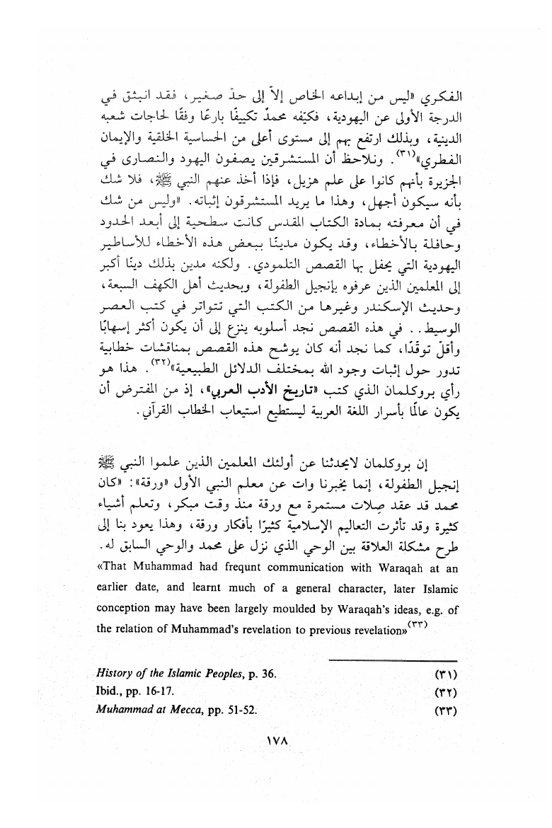 نام کتاب : الاستشراق في السيرة النبوية دراسة تاريخية لآراء (وات-بروكلمان-فلهاوزن) مقارنة بالرؤية الإسلامية نویسنده : عبد الله محمد الأمين النعيمي جلد : 1 صفحه : 178